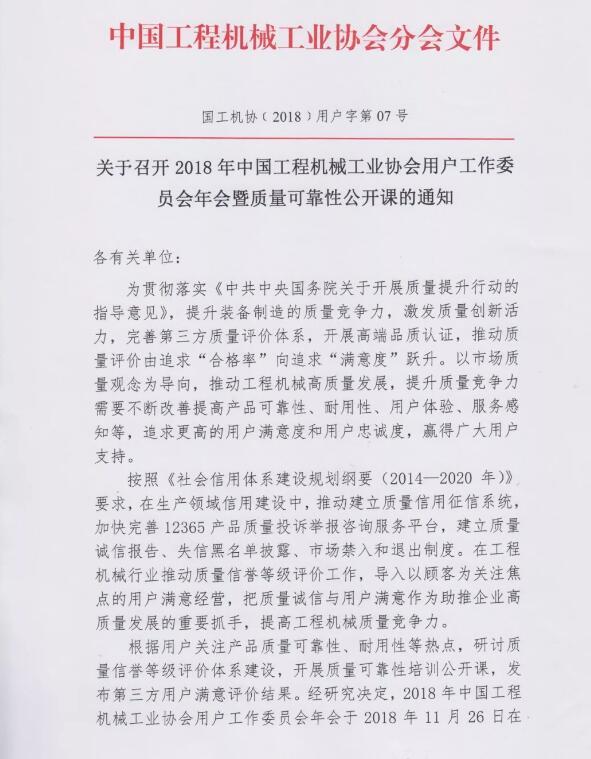 中國(guó)工程機(jī)械工業(yè)協(xié)會(huì)用戶工作委員會(huì)關(guān)于召開2018年年會(huì)暨質(zhì)量可靠性公開課的通知