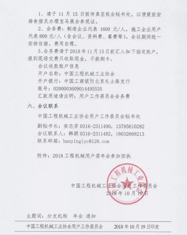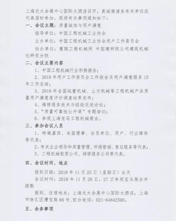 ? ?根據(jù)用戶關(guān)注產(chǎn)品質(zhì)量可靠性、耐用性等熱點(diǎn),研討質(zhì)量信譽(yù)等級(jí)評(píng)價(jià)體系建設(shè),開展質(zhì)量可靠性培訓(xùn)公開課,發(fā)布第三方用戶滿意評(píng)價(jià)結(jié)果。經(jīng)研究決定,2018年中國(guó)工程機(jī)械工業(yè)協(xié)會(huì)用戶工作委員會(huì)年會(huì)于2018年11月26日在上海光大會(huì)展中心國(guó)際大酒店召開,真誠(chéng)邀請(qǐng)各有關(guān)單位派代表屆時(shí)參加。現(xiàn)將有關(guān)事項(xiàng)通知如下: