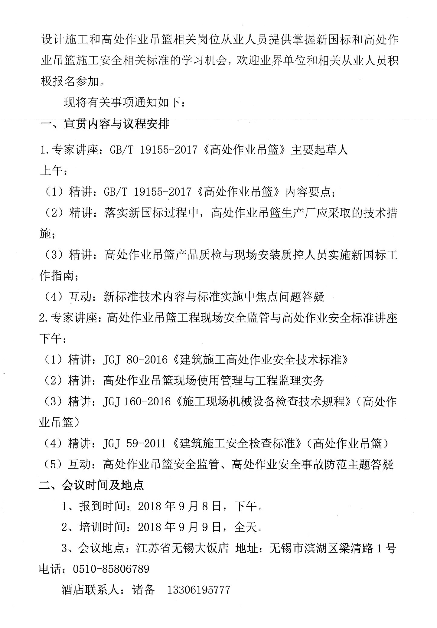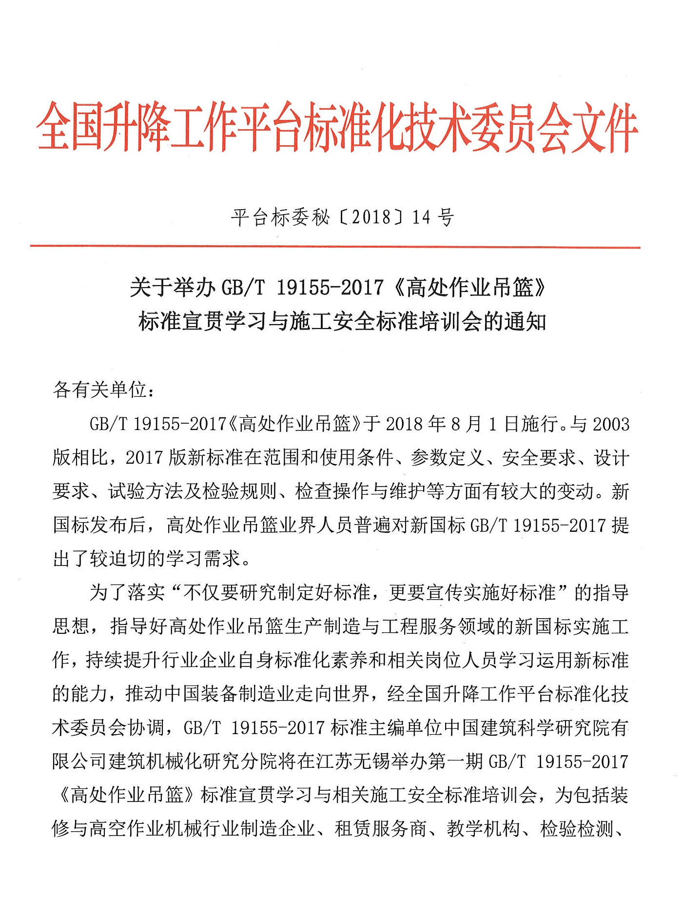 關(guān)于舉辦GB/T 19155-2017《高處作業(yè)吊籃》 標(biāo)準(zhǔn)宣貫學(xué)習(xí)與施工安全標(biāo)準(zhǔn)培訓(xùn)會的通知