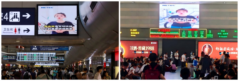 北京西站作為亞洲規(guī)模領(lǐng)先、客流量密集的現(xiàn)代化鐵路樞紐,每日承擔(dān)數(shù)十萬旅客的出行服務(wù)。車站方深知提升旅客安全乘梯意識(shí)的重要性,在自媒體平臺(tái)看到上述科普視頻后,主動(dòng)聯(lián)系NETEC并提出轉(zhuǎn)播申請(qǐng)。經(jīng)友好溝通,NETEC 同意北京西站在其候車大廳核心區(qū)域的電子顯示屏上,全天候高頻次滾動(dòng)播放該視頻。